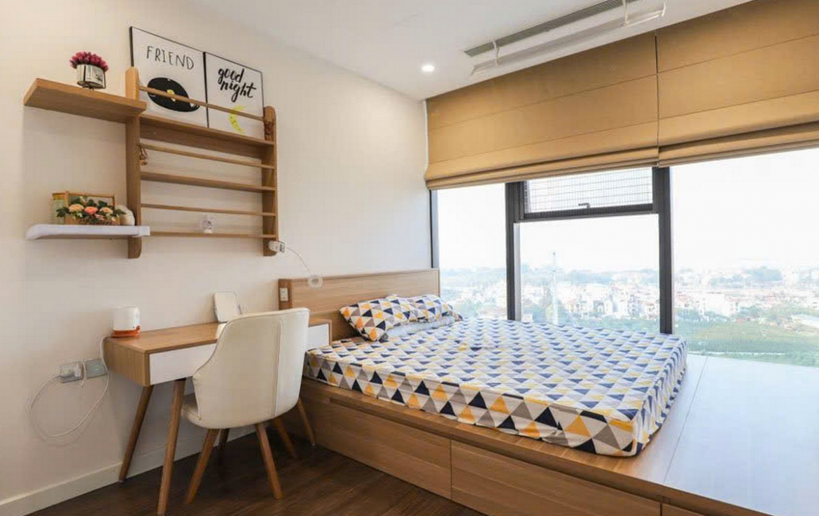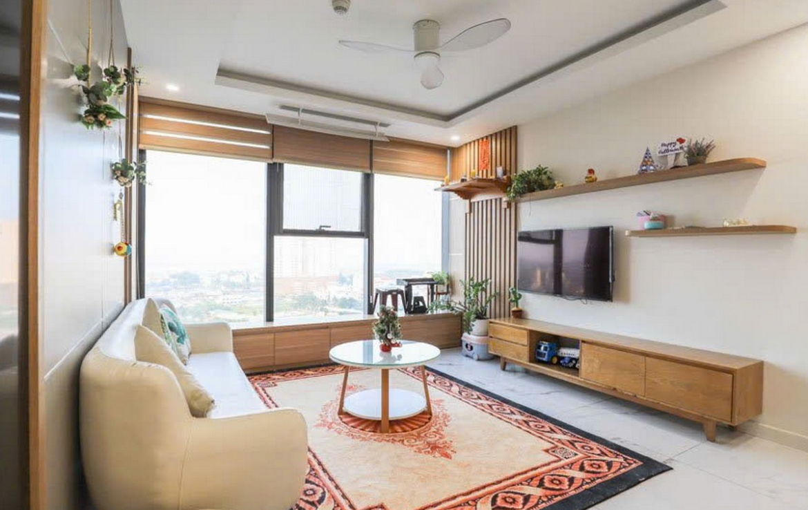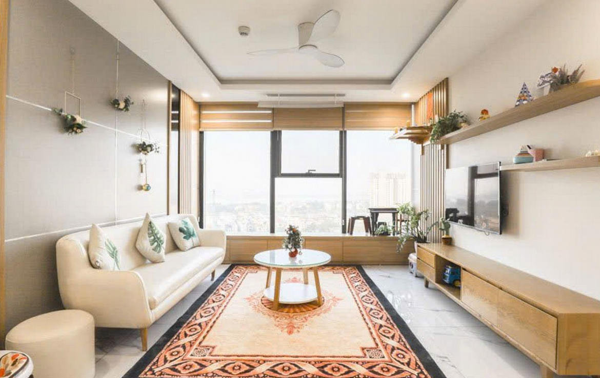 Phòng khách được bố trí linh hoạt với ghế dài gần cửa sổ. Cả 03 phòng ngủ đều có cửa sổ lớn giúp căn hộ tận dụng được nguồn ánh sáng tự nhiên.