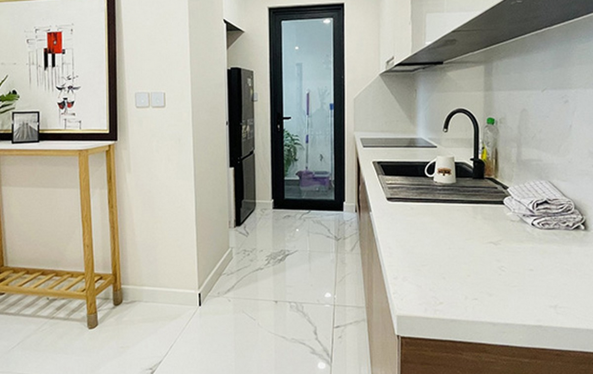 Căn hộ thiết kế theo phong cách hiện đại với tông màu chủ đạo xuyên suốt không gian là tông màu be ấm áp. Tuy diện tích hạn chế, việc phân chia tủ – kệ, phụ kiện và thiết bị bếp được bố trí hợp lý, đáp ứng nhu cầu sử dụng của gia chủ, đồng thời vẫn đầy đủ tiện nghi và gọn gàng.
